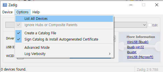 3. 프로그램을 실행하고, Options -> list All devices 를 선택합니다.